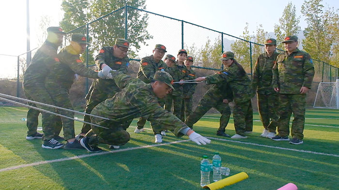 開訓前,在破冰啟航環節——【智勇通關】項目中,每組選一個大魔王來防守別隊,該隊隊員依次挑戰大魔王,石頭剪刀布定輸贏,贏了直接通過,輸了轉一圈,回來接著挑戰,再輸即增加圈數,直到全部隊員通過。大家把團隊當成了自己的“城堡”,在“對抗魔王”中,每個隊員都拼盡全力,期待被幸運女神光顧,期待團隊能盡早完成任務,大家的歡笑聲、喝彩聲灑滿了訓練場。