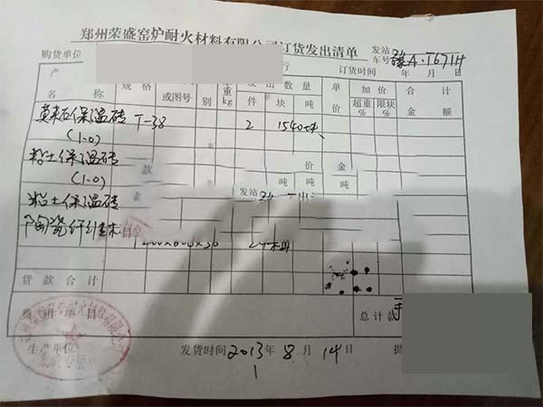 8月14日,鄭州榮盛耐材向?qū)幉ǹ蛻魷?zhǔn)時(shí)發(fā)貨,這次發(fā)出的產(chǎn)品主要包括1540塊密度為1.0的T-38莫來石保溫磚、1540塊密度為1.0的T-38粘土保溫磚、730塊T-3 粘土保溫磚和24箱1200*600*50的陶瓷纖維板。
