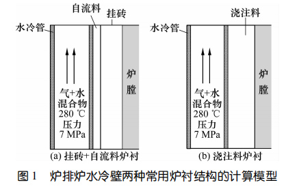 國內(nèi)外爐排爐在水冷壁內(nèi)襯結構設計上有較大差別,國外爐排爐水冷壁內(nèi)襯結構為鰭片(扁鋼)掛釘+SiC掛磚+SiC自流料填充密封,簡稱膜式壁結構;國內(nèi)則為水冷管錨固釘+SiC澆注料結構。不同的爐襯材質(zhì)和結構對水冷壁內(nèi)襯傳熱有較大影響,目前尚未見爐排爐水冷壁內(nèi)襯熱傳導研究報道。