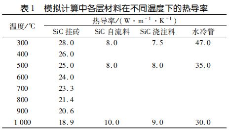 水冷壁內(nèi)襯的熱傳導性能需要與爐況相匹配,既要盡可能多地將熱量傳導出去發(fā)電,又要保證一通道出口溫度不低于 850℃。模擬計算設定耐火材料熱導率恒定,暫不考慮使用過程中耐火材料組成變化對熱導率的影響和爐襯表面積灰對爐襯熱傳導的影響也不考慮掛釘和錨固釘對熱傳導的影響。進行模擬計算時,水冷壁內(nèi)襯各工作層選取的熱導率見表1。