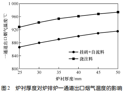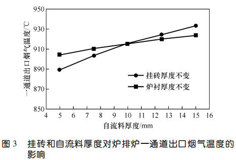 2、對于掛磚+自流料爐襯,掛磚厚度不變時,自流料厚度越大,一通道出口煙氣溫度越高;爐襯總厚度不變時,掛磚越厚、自流料層越薄,一通道出口煙氣溫度越低;爐襯各工作層厚度固定時,一通道出口煙氣溫度隨自流料熱導率的升高而降低,通過調(diào)整自流料熱導率,一通道出口煙溫差值可達 70 ℃。