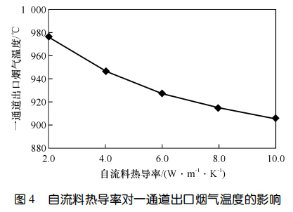 SiC 自流料熱導率對一通道出口煙氣溫度的影響圖4示出了自流料熱導率對一通道出口煙氣溫度的影響。可以看出,爐襯各工作層厚度固定時,一通道出口煙氣溫度隨自流料熱導率的升高而降低。通過調(diào)整自流料熱導率,一通道出口煙氣溫度差值高達 70 ℃。