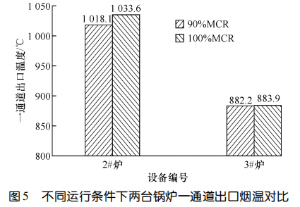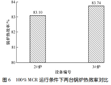 兩臺設備運行 11 個月后進行了能效測試。圖5對比了 90%鍋爐大的連續(xù)蒸發(fā)量(簡稱 MCR)和100%MCR 條件下鍋爐一通道的出口煙溫。圖6示出了100%MCR運行條件下兩臺鍋爐熱效率的對比。結果顯示:在 90%MCR 運行條件下,3#爐一通道出口煙溫比2#爐低 135.9 ℃,在100%MCR 運行條件下,3#爐一通道出口煙溫比 2#爐低 149.7 ℃,3#爐的熱效率比 2#爐高 0.64%。相較而言,使用膜式壁爐襯的3#爐在負荷相當?shù)那闆r下,余熱鍋爐熱效率更高。